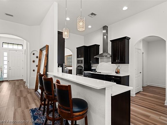 Stunning! Better than new! This wonderfully modern, 2021 built home has great UPGRADES including: 11' high ceilings, gourmet kitchen, double pane windows, gutters, wide baseboards and beautiful wood-like flooring throughout. Boasting just under 2,500 sq. ft. of living space with 4 bedrooms plus office, split floor plan and a deep 2 car garage. Gorgeous, spacious, gourmet kitchen highlighted by quartz countertops, subway tile backsplash, sleek stainless-steel appliances, farmhouse sink, pantry and roomy breakfast bar for 4. Enjoy your favorite meals in the formal dining room or the cozy breakfast nook.