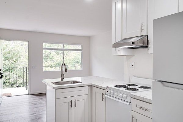 Quartz countertopsNew white cabinetsHardwood vinyl flooring