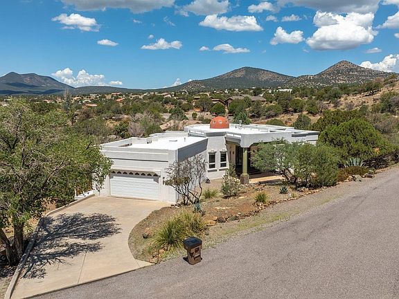 A stunning Mediterranean-inspired retreat with a signature dome, graceful balconies, and breathtaking views in every direction. Nestled in the Indian Hills neighborhood, this beautifully maintained home welcomes you with an impressive entry and a soaring living room featuring cathedral ceilings, elegant built-ins, and a cozy fireplace. French doors open to balconies that invite the outdoors in. The spacious primary suite is a sanctuary with custom built-ins, a massive walk-in closet, glass block accents, double sinks, soaking tub, shower, and makeup vanity. Upstairs bedrooms offer hardwood floors and charming built-ins. The kitchen delights with panoramic views, stainless steel appliances, and custom cabinetry. Thoughtful 1/2 bath off kitchen. All appliances stay. A wide driveway accommodates RV parking. Thoughtfully designed outdoor spaces offer quiet nooks to relax in nature. Downstairs guest suite or vacation rental with private entry, plus a large workshop below. Sauna conveys.