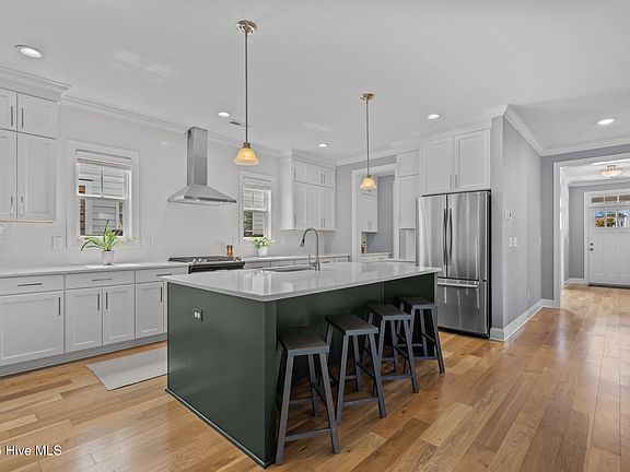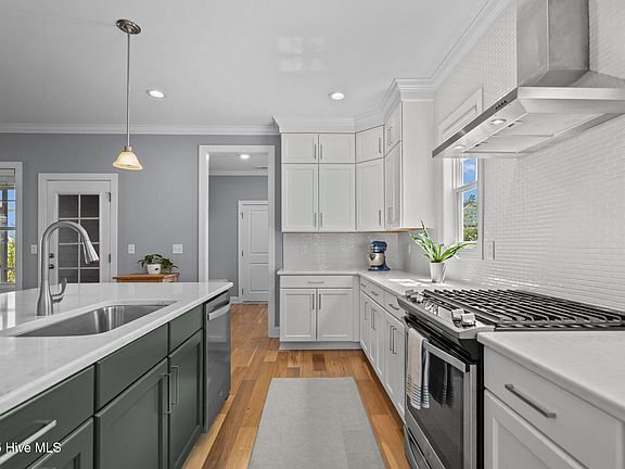 This gorgeous coastal home is situated on an elevated lot within the desirable Riverlights community. Enjoy bird watching from the large front porch w/ rare views of the nearby nature park. As you enter the home, you'll be greeted with a spacious formal dining room with stunning oversized wood beams that canopy the space. Indulge in the spectacular upgraded kitchen, sure to impress with gorgeous quartz countertops, maximum storage w/ upgraded floor-to-ceiling soft-close wood cabinetry, tile to ceiling, backless gas range w/ hood, charming butler's pantry & a walk-in pantry for ample storage. The oversized island anchors the kitchen & is a perfect space for entertaining, just off the spacious living room. The space is flanked by a gas fireplace with shiplap surround & wood mantle & ample natural light from the many windows. The rear mudroom adjoins the two-car garage & includes upgraded built-in cubbies. This home offers a main-level bedroom that overlooks the front porch, as well as a full bathroom that is conveniently located downstairs.