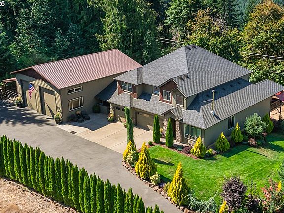 Experience elevated living in this entertainer's retreat, rooted in the spirit of the Pacific Northwest. Surrounded by trails, lush landscaping, and wide-open views, this home is made for hosting and built for living! Inside, tall ceilings, detailed millwork, and thoughtful finishes create spaces that feel refined and welcoming. As you enter, the wood stove creates a cozy ambiance to keep you warm all winter long. The chef’s kitchen is designed for gathering, featuring knotty cabinetry, granite tile counters, double ovens, gas range, coffee bar, and a walk-in butlers pantry. The main floor primary suite offers a soaking tub, dual shower heads, and a custom walk-in closet with private laundry. A large bonus room adds flexibility, perfect for movie nights, play, or a home studio. From summer evenings to hobbies and hosting, the outdoors has it all! A 24x14 covered outdoor kitchen featuring grills, sink, built-in storage, and mounted TV, for a versatile outdoor retreat. An oversized deck with retractable awning, covered hot tub, fire pit area, secret garden pathway, and a full playground create spaces to enjoy year-round. Cherry and apple trees, manicured landscaping with full irrigation, and surrounding arborvitae give privacy for a serene setting. The 38x48 shop provides versatility, offering oversized RV/boat doors, loft storage, built-in racks, electricity, and a private office. Covered RV parking, wood storage, and built-ins ensure everything has its place. Additional upgrades include a whole-home fire suppression & sprinkler system, generator hookup, well w/water softener & iron filtration. A secure gated entry provides an estate-like feel. Here, you’re never far from what makes the NW special with miles of equestrian and ATV trails, the Banks-Vernonia Trail, local markets, and the quiet charm of small-town living, all within easy reach of the city and Nike and Intel. Luxury, leisure, and lifestyle all in one place.
