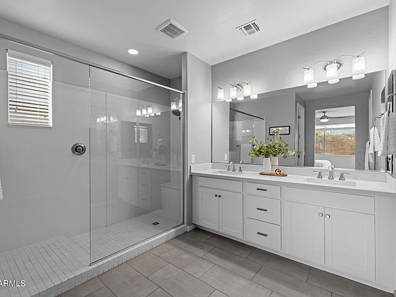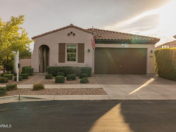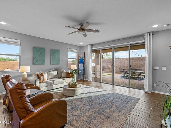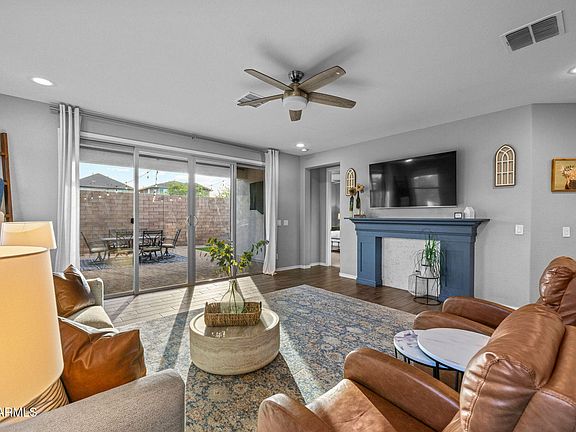 Welcome to this stunning 4 bedroom, 2 bathroom home in the heart of Eastmark, designed for both comfort and style. From the moment you step inside, the open-concept floor plan and wood plank tile flooring set the tone for modern living. The great room is bright and inviting with recessed lighting, a faux fireplace, and a seamless flow into the chef's kitchen. Here, you'll find white shaker cabinets, a designer backsplash, gleaming quartz countertops, an composite granite sink, and a brand-new microwave. The oversized island offers plenty of space for casual dining and entertaining, while pendant lighting adds the perfect finishing touch. The primary suite is a true retreat with its expansive super shower and floor-to-ceiling tile, creating a spa-like atmosphere. Double vanities with quartz countertops and a large walk-in closet add both function and sophistication. Secondary bedrooms feature plush Berber carpet for comfort, while the laundry room with built-in cabinets makes organization a breeze. Smart upgrades include a new tankless hot water heater with a recirculating pump, EV outlet, recessed lighting throughout, and brand-new turf.