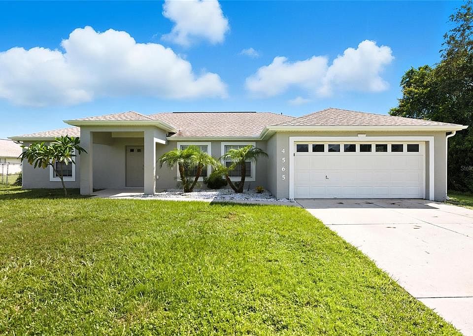 Welcome home to 4565 Adolph Ave, a beautifully maintained 3-bedroom, 2-bathroom house with 1,724 sq ft of spacious living in a serene and peaceful North Port neighborhood. Built in 2006 and freshly painted inside and out, this home is ready to be a part of your Florida lifestyle. Enter into a voluminous living room - providing plenty of space for you and your guests - awash with natural light, where sliding doors and an open floor plan flow toward a pass-through eat-in kitchen. The kitchen features newer appliances and gleaming quartz counters — providing an ideal space for everyday living or entertaining. The vaulted ceilings across the living spaces give an airy vibe and a second set of sliding doors allow the party to flow naturally from living room to kitchen to spacious outdoor screened patio. The primary suite offers a relaxing retreat: luxurious LVP flooring, large walk-in closet, and an ensuite bath with shower/tub and a linen closet. Two additional bedrooms share a well-appointed hall bath, also featuring durable LVP flooring and thoughtful finishes. Convenience abounds with a large laundry room, plus a generous lot size with attractive landscaping (mini palms, shell ground cover) that adds personality and low-maintenance curb appeal. With a two-car garage, solid infrastructure (HVAC - 2017, water heater - 2021), and in a location close to schools, shopping, parks, this home is ready for move-in and designed for living well. X-flood zone = no flood insurance required and a prior solid LTR rental history make this home a great option!