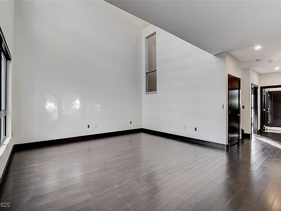 This stunning 1,800 sq ft Panorama Tower 2, Pool Villa offers luxury living with dark wood floors throughout. The downstairs features a spacious great room with vaulted ceilings, a dining area, and a gourmet kitchen with granite and marble finishes. A bedroom, full bath, and laundry room complete the main level. Upstairs, the loft provides a balcony overlooking the Panorama Towers pool and partial Strip views. The primary bedroom offers a luxurious en-suite with a standing tub. Enjoy outdoor living with a large patio, perfect for relaxing by the pool while taking in beautiful Las Vegas sunsets. Two parking spots, one on the main floor and one on the second floor, complete this exceptional residence.