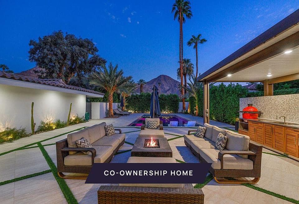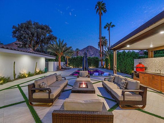 Co-ownership opportunity: Own one-eighth of this turnkey home, professionally managed by Pacaso. With vast spaces inside and out, this 4-bedroom, 4-bath Coachella Valley home is designed for spending quality time with family and friends. The living room sets the home's tone of relaxed sophistication. Contemporary furnishings make it easy to chat or binge watch a favorite show. Sliding glass doors connect to a shaded outdoor seating area. The spacious family room includes a pool table, a fireplace and plenty of couches for gaming or watching TV. The room opens to the gorgeous kitchen with a dramatic waterfall island, wood cabinets and high-end appliances, including a full-size beverage refrigerator. It's easy to grab a snack, serve guests in the elegant dining room or prepare a casual meal on the covered patio. The backyard patio also has loads of comfortable seating surrounding a fire table. A covered outdoor kitchen features a stainless steel gas grill and a ceramic charcoal cooker. This perfect palm-edged oasis offers a large pool and spa, with views of the mountains. The calm and spacious primary suite has a seating area that faces a gas fireplace and TV, and doors that open to the private yard. There's tons of storage in the roomy closet, and the bright en suite bathroom features a long double vanity, a relaxing soaking tub and a tiled shower. This one-level home has a Spanish-style tile roof and mature landscaping.