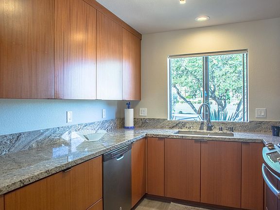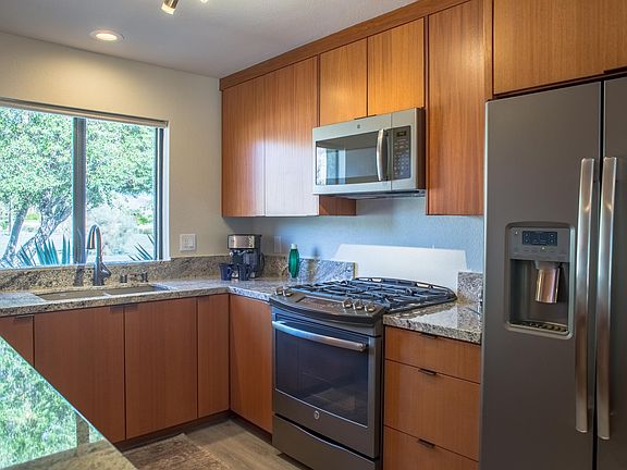 Available furnished for shorter-term or longer-term renters. Includes all linens and housewares. Granite and marble countertops, cherry wood cabinets, nice lighting, waterproof flooring, slate appliances, and fixtures. These elements, coupled with the relaxed atmosphere on the patio and at the pool, PLUS within walking distance to El Paseo, all add up to a comfortable, styled home. Elegant but comfortable furnishings, high ceilings with lots of light, new windows, 2 sliding doors to patio - all within an easy living environment. One-car garage and driveway, plus one carport.