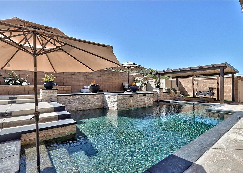 The resort-style backyard has been meticulously designed for both relaxation and entertainment, featuring a custom pool, sunken bar, built-in barbecue, and a firepit. The 3-car garage offers ample storage and includes a Tesla charging station.