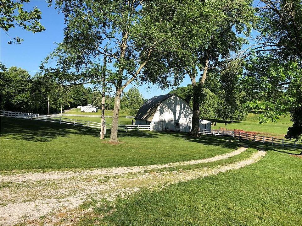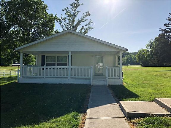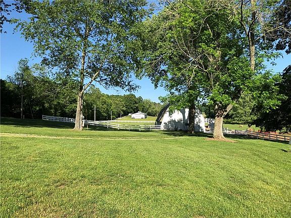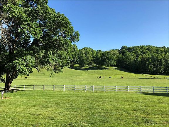 The home has new windows and new blinds, the air conditioner is only 4 years old. It has 3 bedrooms, 2 baths, a nice laundry room, an eat-in kitchen, large great room and a covered front porch. There is also a 2 car detached garage that's 24' x 31', an older barn that's 32' x 60' a new Amish built barn that's 52' x 102', fenced pastures and a bridge over the creek. The well is spring fed from the creek that runs across the property. The property consists of 2 parcels. 1 parcel is 56.24 acres. Weather vane on old barn is not included.