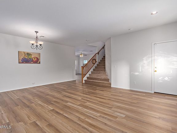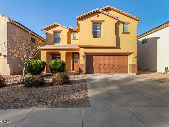 Welcome to this lovely 4-bedroom, 2.5 bathroom + Huge Loft home in Maricopa Meadows! Fresh Exterior and Interior paint. Brand new wood looking laminate flooring and carpet. Enter the front door to the wide open area normally used for Formal Living Room and Dining. Continue around to the Open floorplan of the kitchen and Family Room. The family room has a sliding door that leads to the low maintenance backyard for seamless indoor-outdoor living. Cook delicious meals in the kitchen, equipped with ample upgraded wood cabinetry with crown moulding, recessed can lighting, essential built-in appliances, a walk-in pantry, and an island. Don't miss the power room. Discover the upstairs area by walking up the wide steps to the enormous loft area. This could be converted to an additional bedroom This could be converted to an additional bedroom, if you needed that room. Double doors lead to the sizeable main bedroom, offering plush carpeting, a private bathroom with a separate shower and garden tub, and a walk-in closet. Be sure to check out the secondary bedrooms that have walk-in closets too. Venture out onto the large backyard, complete with a covered patio, garden beds, and abundant space for crafting your dream oasis. The water softener system and one AC unit is less than 1 year old.