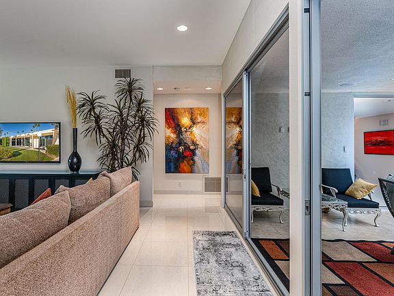 Soon to be designated an Historic Landmark of Indian Wells, this little enclave is very special, and this unit is particularly so. The Sandpiper development company built a fair number of condominiums in both Palm Desert and Indian Wells back in the day i.e. Mid-Century. Inside Indian Well Country Club there are eleven so called pods with units surrounding a green space & pool. Nine of them have eight buildings with two units each thus 16 in total. Two of them have four buildings with two units each, thus only 8 units with huge, meticulously well-kept green spaces. All designed by renown architect William Krissel. This is in one of the units of eight therefore very rare, and with a great Southwest view, significantly remodeled in 2014 and updated including a custom enlarged kitchen and all new high quality argon gas filled windows and sliding doors. The charming atrium has recently installed overhead alumiwood stat sun screen and provides a very private outdoor space. 2,900 sq. ft. (not including the atrium) and a 2.5 car attached garage (most in the area are not). These rarely come on the market especially ones that are completely renovated and a view. My suggestion is Do Not Hesitate.