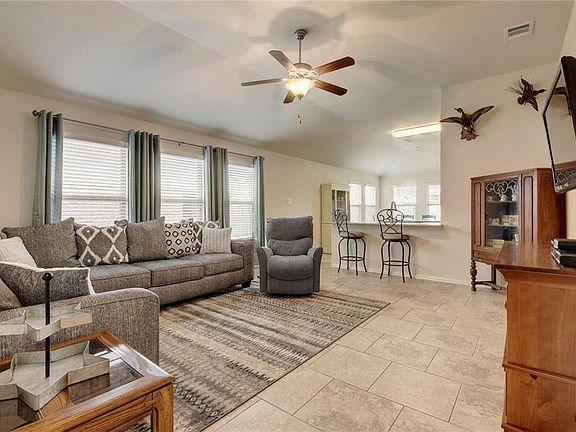 Meticulously maintained 3Bed/2Bath home with 2.5 car garage in great neighborhood. Open floor plan with large ceramic tile throughout. Carpet in hall & bedrooms only. Spacious living room with tall ceilings. Large kitchen has gas stove, dark cabinets with light granite countertops, center island, tile backsplash. Huge master suite with garden tub, separate shower & oversized closet. Epoxy Coated Garage Floor, Water Softener, Nest Thermostat. Refrigerator & garage door openers included. Easy commute to Austin or San Antonio. Community pool & playground.