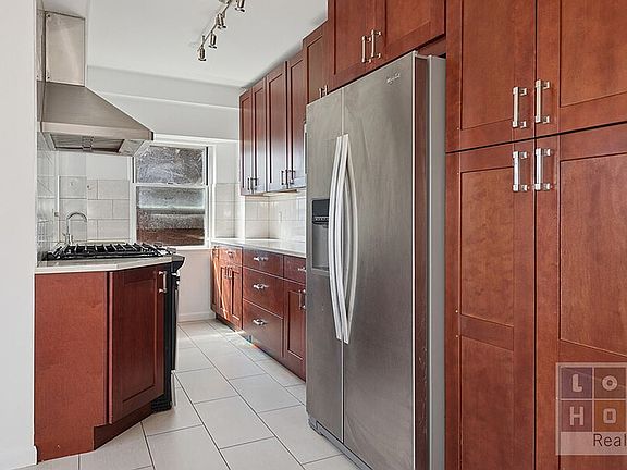 The updated kitchen is a chef's dream, showcasing an abundance of wooden cabinets, modern countertops, a stylish backsplash, and contemporary appliances. At the other end of the apartment, you’ll discover a renovated, windowed bath and two spacious bedrooms, each easily accommodating king-sized beds, dressers, and more.