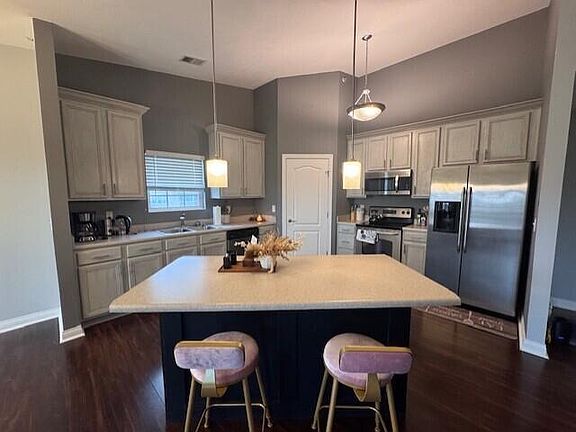 Beautifully maintained 2-bedroom condo featuring soaring cathedral ceilings and a spacious, thoughtfully updated open floor plan with Vinyl Plank floors. The bright and cheerful kitchen is a standout, offering 42'' cabinetry with decorative crown molding, a large center island with elegant pendant lighting, and a walk-in corner pantry—perfect for both everyday living and entertaining. The inviting primary suite includes a generous walk-in closet and an en-suite bath with a walk-in shower w/seating. A separate laundry room adds convenience with extra cabinetry for additional storage. Washer (newer) & Dryer are included. Water Heater 1 yr. Step outside to the covered deck and enjoy serene views of the pond and fountain—a perfect spot to relax and unwind.