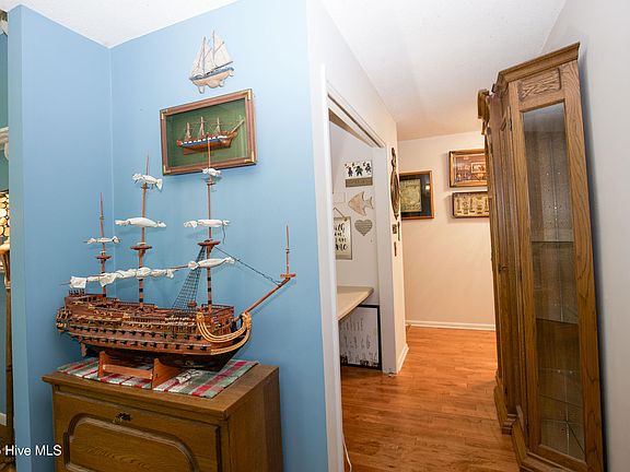 The generously sized primary suite includes an en-suite bathroom with a makeup vanity, sink, large mirror, and ample lighting. It also features a walk-in closet and a private bathroom with a shower. A large armoire in the bedroom may remain with the home if the buyer is interested. Two additional bedrooms are located on the same side of the house as the primary suite, accessed via a hallway that passes the kitchen, laundry room, and a full bathroom. One of these rooms currently serves as a den. The home also offers abundant storage, including a conveniently located laundry room.