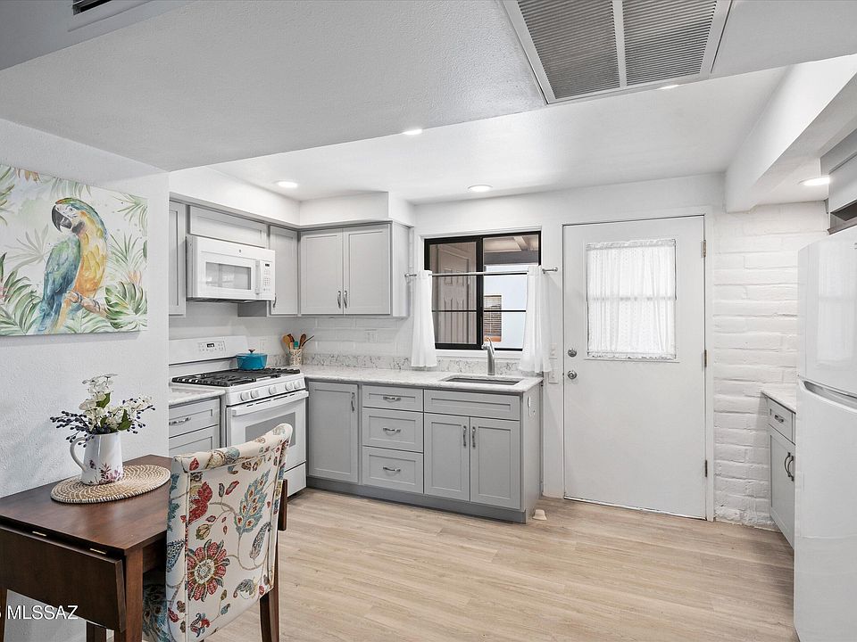 Welcome to this beautifully updated 1 bed, 1 bath condo in the highly sought-after Haven Green Valley Villas West community. This move-in-ready home perfectly combines comfort, convenience, and modern style. Inside, enjoy a fully remodeled kitchen with white appliances, quartz countertops, soft-close drawers, and brand new cabinetry offering generous storage. The bathroom has been tastefully redesigned, replacing the tub with a spacious walk-in shower. Durable vinyl plank flooring flows throughout, adding warmth and elegance. All windows have been upgraded to energy-efficient triple pane glass, and new wrought iron security doors and front gate enhance both safety and curb appeal. Outside, the laundry shed has been finished with drywall and wire shelving for extra storage. A MUST SEE!