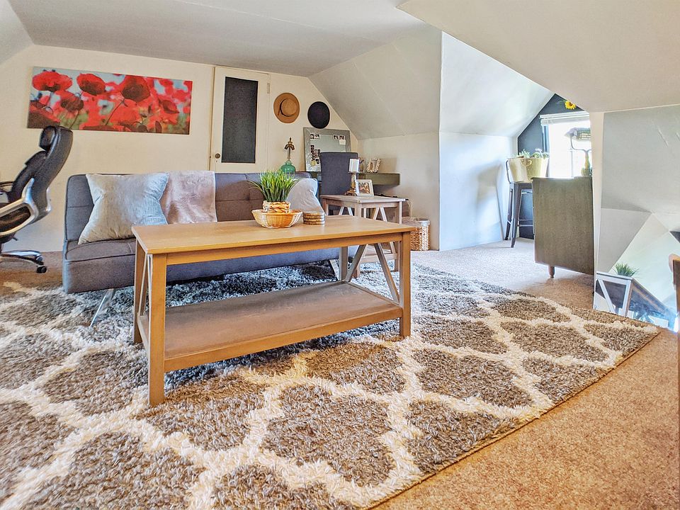 This quiet one bedroom penthouse is the perfect place for the person wanting to be near campus and downtown in a place you can come home to and live in peace and quiet. It is convenient to campus, the farmer's market, downtown riverfront, library, shopping and coffee shops-no car needed! This unique apartment includes a large living room with dormer windows and walk-in closet, kitchen tile counters and wood laminate flooring and living room carpeting, fridge and newer gas range, bathroom, including a tub with legs and shower attachment, and bedroom/office (technically a studio if used this way, but a very large one). The unit is the entire upper floor of the building, so no neighbors are next door or above you. We pay water/sewer/garbage, so the tenant only has the electric and natural gas to cover. The building is weatherized with natural gas heating. We also have a washer/dryer on the property for tenants to use. Info * Coin-op laundry * Off street parking (first come, first serve) *