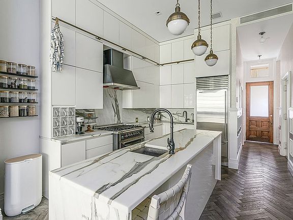 Throughout, French white oak herringbone floors and richly detailed wood doors evoke warmth and worldliness. Modern comforts include abundant custom storage, a vented washer/dryer, HVAC, disposal, a vented gas range, and water filtration system.