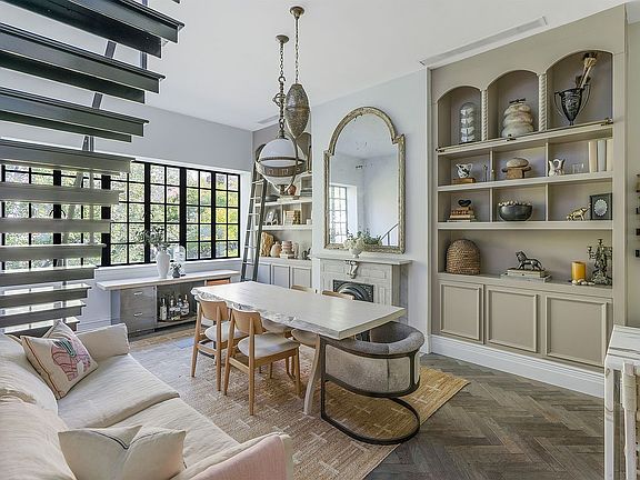 The sun-filled great room serves as the heart of the home, with an elegant open layout that includes a dining area and a chef’s kitchen anchored by a wood-burning fireplace framed by tall custom built-ins. The marble-clad kitchen is a showpiece, featuring a Sub-Zero refrigerator, 4-burner gas range with grill, deep stainless-steel sink, and an expansive island with a secondary prep sink. Floor-to-ceiling cabinetry provides exceptional storage and is accented by a charming rolling ladder.