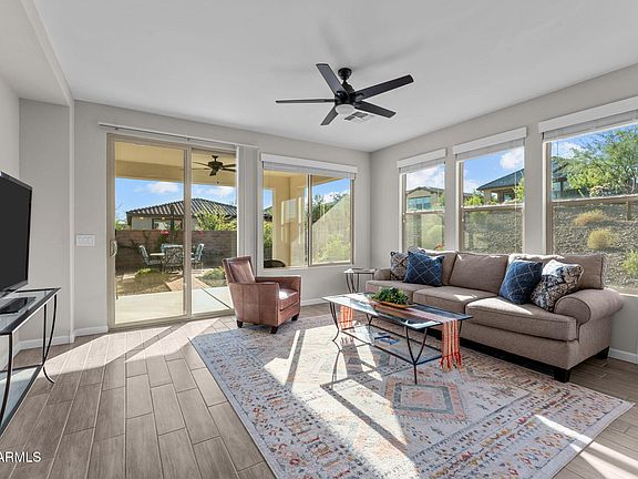 This inviting, fully furnished, turnkey 2-bedroom, 2-bathroom home in Wickenburg Ranch perfectly blends modern design with everyday comfort. The open floor plan is centered around a stunning kitchen featuring granite countertops, a subway tile backsplash, stainless steel appliances, and a large island that serves as the heart of the home for both casual meals and entertaining. Natural light pours in through the sliding glass door and windows, creating a bright, airy atmosphere throughout the living and dining areas. The primary suite offers a relaxing retreat with a well-appointed bathroom and generous closet space, while the secondary bedroom provides flexibility for guests or a home office. Outside, a covered porch is the perfect spot to unwind, and the desert landscaping adds beauty and curb appeal with ease. With its thoughtful layout and stylish finishes, this home captures the best of modern desert living in Wickenburg Ranch.