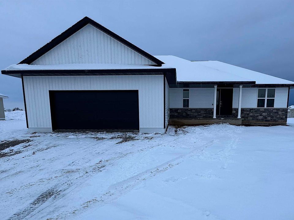 Looking for a new ranch in the Village of Howard? Enjoy this 1,476sf split bdrm design w/3 bdrms & 2 full baths. Inviting foyer opens to the large living room w/cathedral ceilings. Kitchen w/custom maple cabinets, an island w/snack ledge, large pantry & SS dishwasher & microwave. Master bdrm features a step tray ceiling, walk-in closet & private bath w/walk-in shower. Upgrades incl LVP throughout home excluding bdrms & bsmnt steps. Convenient 1st-flr lndry. Entry way w/bench & hooks off the 2-stall att. garage. Full bsmnt w/egress window & stubbed for a future bath. Exterior w/covered front porch w/porch posts, vertical & horizontal vinyl siding & stone per plan. Virtual staging in photos.