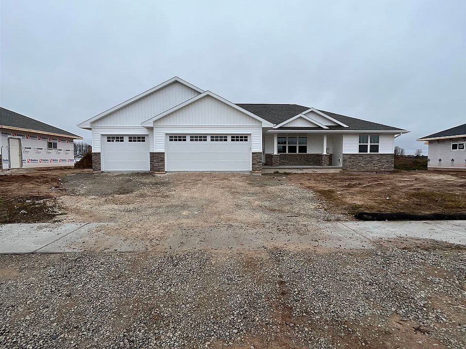 Gorgeous brand new style home w/1,632sf ranch w/an open concept flr plan. Kitchen has custom maple cabinets, a large walk-in pantry, island w/storage & seating, an OTR microwave & dishwasher. Cathedral ceilings in the kitchen, dinette & living room. Mdrm w/a bench & hooks. Private master bdrm w/tray ceiling, extra large walk-in closet w/access to 1st floor lndry rm, full bath w/walk-in shower, & double sinks. Bsmnt has exposure & is plumbed for an addl. bath. Attached 3-stall garage. Exterior features stone per plan, horizontal siding, & vertical siding in the peaks. Virtual staging in photos. Upgrades: Home - Electrical, Granite Countertops, Roll-Out Garbage in Island, FP Stone, & FP Outlet. Garage - Gas Line & Vent for Future Heater, Insulate Remaining Walls & Ceiling & Plumbing.