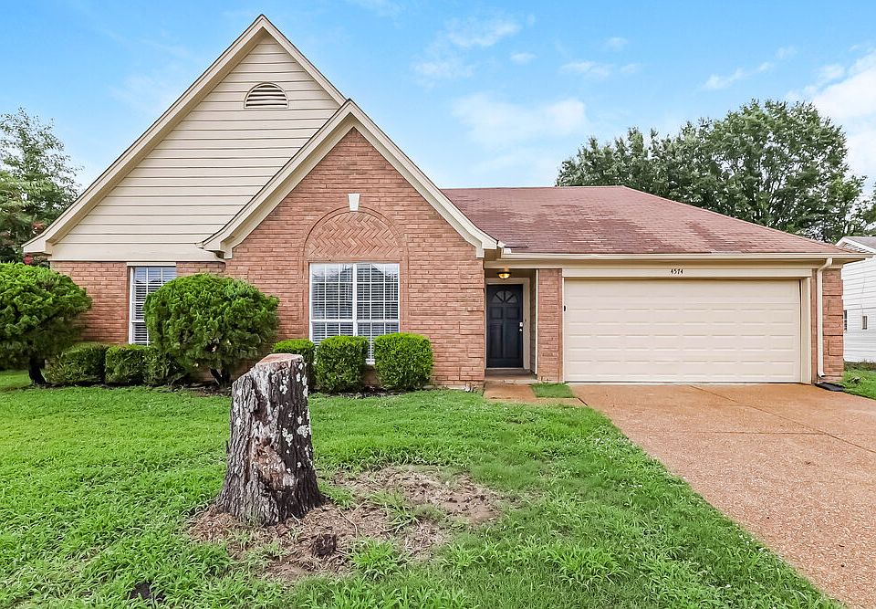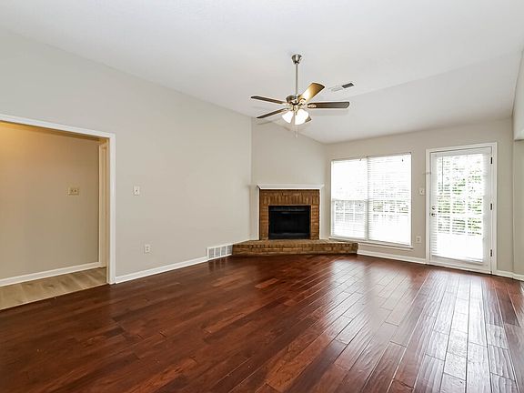 Enjoy great amenities like a patio and an attached two-car garage when you choose this Memphis, TN rental home. The one-level house offers three bedrooms, two bathrooms, and a convenient laundry room. In the living room, a charming brick fireplace and gorgeous hardwood flooring will impress you. The kitchen's white quartz countertops and all-white cabinetry provide a pleasant contrast to the modern stainless steel appliances, and there's ample room for storing your supplies in the pantry. Soft carpeting and a lighted ceiling fan offer comfort in the spacious main bedroom suite, where you'll have a walk-in closet and a private bathroom with two vanity sinks.