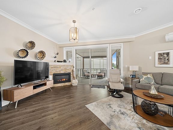 Englewood Courtyard – master-planned, gated 45+ community near Garrison Crossing & Rotary Trail. Spacious inside corner unit, one of the largest in the building! Features 2 bedrooms + den, 2 baths, laminate flooring, 9’ ceilings, quartz counters, maple shaker cabinets with roll-outs, pantry, under-cabinet lighting, and upgraded appliances. Includes 1 parking stall & 2 storage lockers. Large walk-in closet, A/C, gas fireplace, and gas BBQ hookup on the sunny patio. Enjoy the clubhouse, guest suites, RV parking—a pet & people-friendly community! Call today to view.