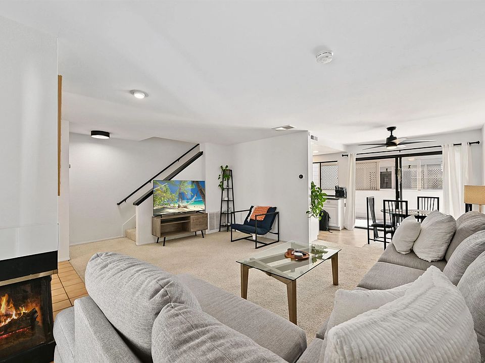 Located in the heart of Clairemont, this stunning, fully-updated, VA approved Clairemont townhome blends modern upgrades with exceptional livability. Enjoy seamless indoor-outdoor living with three private balconies, perfect for morning coffee, evening sunsets, or entertaining guests. The expansive primary suite boasts soaring vaulted ceilings, a large closet, and a dual vanity ensuite bath for added comfort. The attached two-car garage offers abundant storage plus a versatile flex space for a small home gym or hobby area. Recent upgrades include a Nest smart thermostat, Ring doorbell camera, granite kitchen countertops, upgraded ceiling lights, and a newer water heater. The open-concept living and dining area is filled with natural light and flows effortlessly to two balconies, perfect for BBQs and gatherings.Set within a well-maintained, VA-approved community with lush green space, sparkling pool, and HOA-covered water and exterior maintenance, this home offers the ultimate low-maintenance lifestyle in one of San Diego’s most desirable neighborhoods. Don’t miss your chance to own this stylish, turnkey townhome in Clairemont!