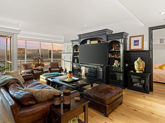 Experience true luxury living in this one-of-a-kind, fully furnished residence on the 28th floor of Panorama Towers. This spectacular 2,324 SF residence features dual primary suites and over $250,000 in upgrades, including solid wide-plank hardwood flooring, custom wainscoting, motorized shades, and sophisticated interior lighting. The chef’s kitchen is both stunning and functional with custom soft-close cabinetry, designer hardware, porcelain countertops and backsplash, brand-new Samsung appliances, a water filtration system, LED uplighting, a custom wet bar with double-drawer refrigerators, and a Sub-Zero wine fridge. The second primary suite was transformed into a dream custom closet with a Murphy bed, jewelry drawers, a built-in safe, a home library, and a lavish marble bathroom. Additional features include Control4 home automation, a Sonos sound system, and remote power blackout shades. This residence offers a magical ambiance w/ breathtaking Red Rock Mountain & sunset views.