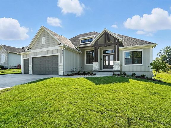 Lot 49. The Oakmont ranch by Legacy Homes of KC. Live in a GOLF COURSE COMMUNITY!! Builder offering a $10,000 credit to the buyer to be used to buy down rate, pay closing costs, or on items like blinds etc. This HOME IS READY NOW!! The home is a "true ranch" with 3 bedrooms and two baths on the main floor! Impressive Great Room with a vaulted ceiling, wood beams and stacked stone fireplace. Spacious Kitchen and Breakfast Area with wood floors, kitchen island, and pantry. Main floor Primary Bedroom and Bath Suite with separate shower & free standing tub, walk in closet leading to the Laundry. Two additional main floor Bedrooms and Full Bath. Huge unfinished basement can be finished. 3 Car Garage. Covered patio, irrigation! High efficiency furnace, whole house humidifier, quartz or granite in kitchen and baths, and Hardwoods in entry, kitchen, dining and great room are just some of the standard upgrades in this home. Builder also provides a 2-10 warranty after closing!