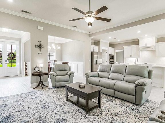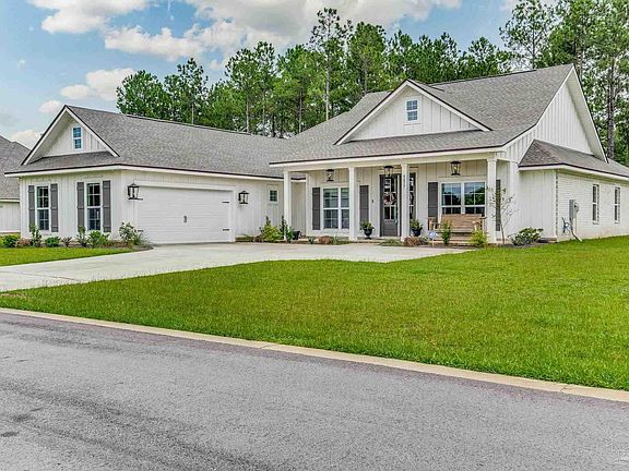 With its white hardy board exterior, wide front porch, and inviting double doors, this pristine 4-bed, 3-full-bath home on a one acre in Jay has a coastal feel with plenty of southern charm. The kitchen is the showpiece of this home and features gorgeous white cabinetry, quartz countertops, oversized subway tile backsplash, large center island with room for seating, wall oven, glass cooktop with hood vent, and HUGE walk-in pantry with room to store and organize food, appliances, and more. A formal dining room is located nearby, with plenty of sunlight from the large front windows overlooking the courtyard entryway. Wood-look tile throughout the common areas adds to the home’s light and airy feel and makes cleaning a breeze. The master bedroom is spacious and features cove lighting, giving the room a soft glow. French doors open to a spa-like master bath with quartz countertops, two separate vanities, large walk-in shower room, and separate soaking tub softly illuminated by a translucent window. Two of the remaining three bedrooms share a full Jack-and-Jill bathroom. A third full bath with a tile shower/tub combo, quartz countertops is easily accessible for guests. Enjoy your one-acre property from the covered back patio.