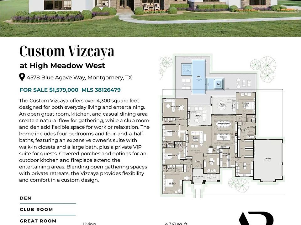 Introducing the Custom Vizcaya by AR Homes, a spacious one-story residence boasting over 4,300 sq ft of living space. This home is perfect for both daily living and entertaining, with an open great room, kitchen, and casual dining area ideal for gatherings. You'll find a club room and den for added flexibility along with a custom prep kitchen. The property features 4 bedrooms, 4 1/2 baths, including a luxurious owner's suite with walk-in closets and a large primary bath. A private VIP guest suite is also included. Outside, enjoy covered porches, a fireplace, and an outdoor kitchen for extended entertaining options. The Vizcaya seamlessly blends open gathering spaces with private retreats, offering comfort and flexibility in a custom design.
