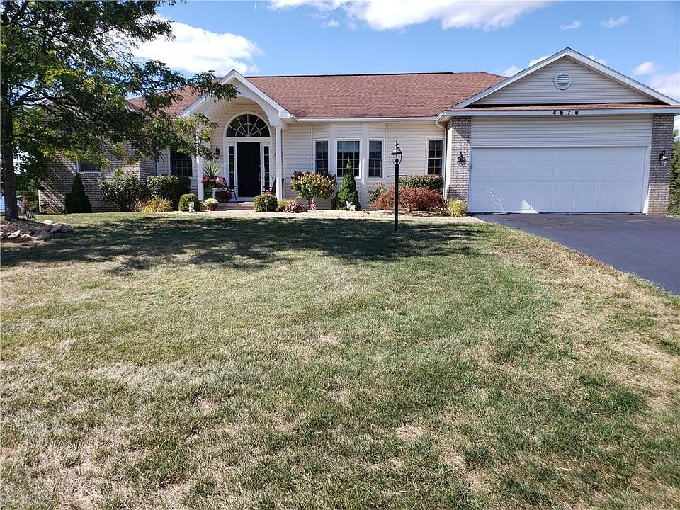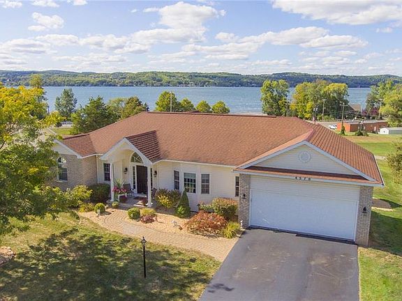 Contemporary ranch offers panoramic and picturesque lake views with spectacular sunsets. This custom designed center foyer entrance has 2750+ square foot living space has two levels. Main floor has spacious living room with vaulted ceiling, open kitchen/dining with custom cabinets, Corian solid surface countertops plus all appliances are included. Formal spacious dining room with high ceiling. Recessed lighting throughout and some tray ceilings. Master bedroom with full bath jacuzzi tub, stand up shower and double sink vanity. Lower level walkout offers family room area with French door. Three additional rooms two egressed windowed bedrooms with full double wide closets and additional room for den/office.