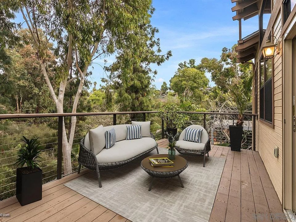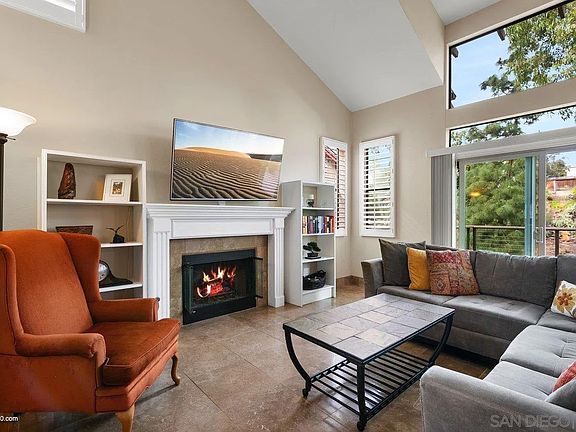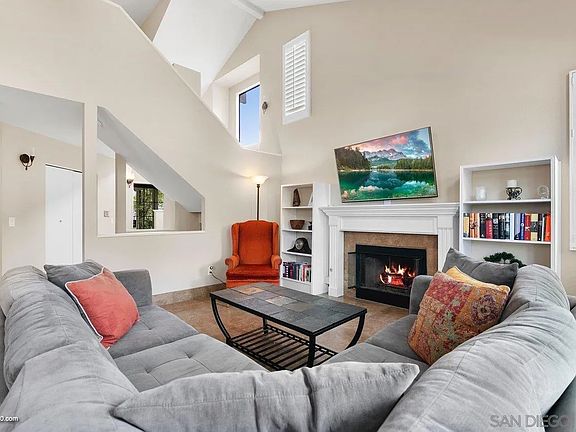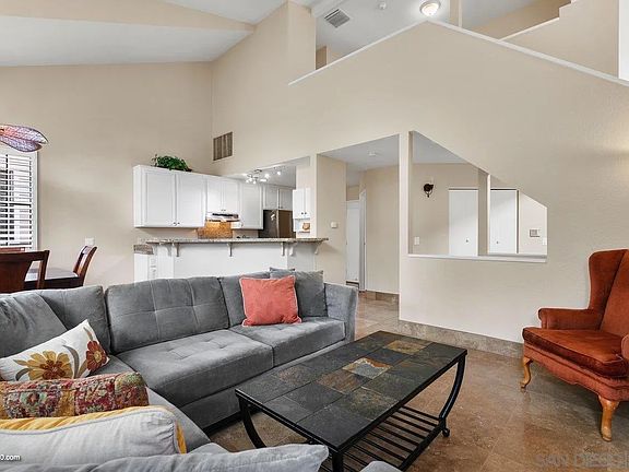 BEST VALUE in College Area: Suburban Oasis on Private Drive set back OFF the street! Quiet, Peaceful, Natural CANYON VIEW from the Upper Deck, just off the living room, and also from the Secluded Backyard offering low maintenance Artificial Turf. A Dramatic 20ft Ceiling in the living room showcases Plantation Shutters accenting Top-to-Bottom Windows and promoting the Open Floor Plan highlighted by Travertine Floors, Granite Counters, and a Cozy Fireplace. The Top Floor Primary Suite includes a Loft Retreat/Office, Granite Countered Dual Basin Vanity, and Walk-In Closet. Direct Entry from Attached Garage. Newer Roof, Solar (paid in full). Perfect for SDSU Off-Campus housing or Single Income Earners pooling their money to Own vs Rent.