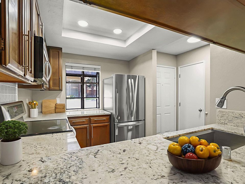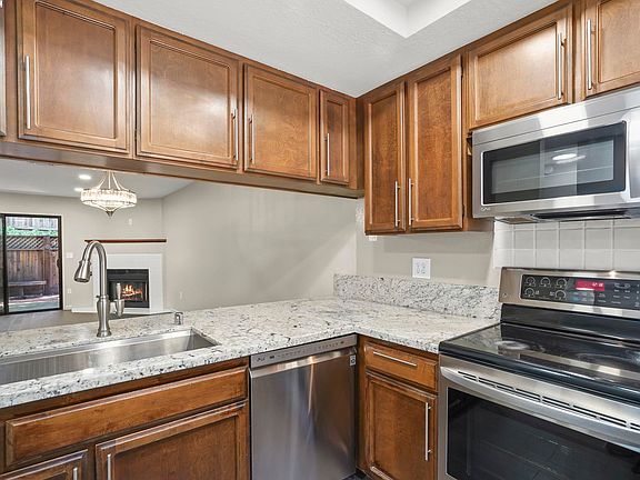OPEN Sunday 1:00-4:00 10/5. Move in ready! Priced to sell! Motivated seller! Bring your offer! Step into this beautifully updated Eastgate townhome-style condo, where comfort meets style in every corner! With 2 spacious bedrooms — one with its own private balcony — and 1.5 baths, you’ll love the smart use of its 1,088 sq ft layout. The modern kitchen shines with stone countertops, stainless steel appliances, a cozy breakfast bar, and a sunny garden window. Enjoy the open-concept living and dining area, complete with a charming fireplace and a slider that opens to your own private patio nestled under redwood trees with no neighbors behind. Plank flooring, central heat and air, plus a stackable washer/dryer add everyday ease, while double-wide bedroom closets and extra storage keep life organized. Relax by the community pool or clubhouse, with HOA perks like water, trash, landscape and building upkeep included. With two parking spots, guest parking, and a prime spot near parks, trails, downtown Martinez hotspots, and quick freeway access — this Eastgate condo is ready to welcome you home!