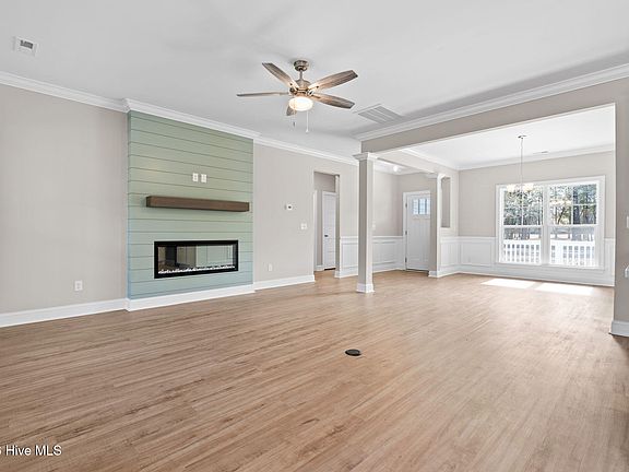 MOVE-IN READY! Discover the perfect blend of modern elegance and coastal living in the stunning 3-bed, 2-bath, home in Lockwood Folly. Spacious and thoughtfully designed, the floor plan offers a welcoming atmosphere complemented by an attached 2-car garage, providing both convenience and ample storage for your coastal lifestyle. Inside, you're be greeted by a foyer that opens into an expansive flex or dining space, perfect for entertaining or casual family gatherings. The open floor plan seamlessly integrates great room, kitchen, & breakfast nook, with plenty of high-end finishes. The linear electric fireplace with shiplap surround and a stained cedar mantle is a standout in the living area. Enjoy the ease of low-maintenance LVP in living and kitchen. The gourmet kitchen boasts sleek quartz countertops, stylish tile backsplash, central island, and oversized pantry, ideal for culinary enthusiasts. The split floor plan offers privacy, with two generously sized guest bedrooms featuring walk-in closets sharing a well-appointed bath. The master suite serves as a serene retreat, complete with a large walk-in closet and an en-suite bath featuring dual vanities and a beautifully designed tile shower. Outside, the semi-wooded lot brings a natural beauty to the property. You can relax on the large covered front porch or entertain on the screened back porch, perfect for enjoying warm Carolina evenings. The slate Hardie plank siding accented with midnight blue shutters and light grey shake details, creates a striking contrast against bright white doors and windows. And, community truly makes a house a home, Lockwood Folly is an established neighborhood with amenities galore including 18-hole golf course, pool, clubhouse, pickleball, tennis, boat dock and boat ramp. This beautiful home is move-in ready so tour today so that you can begin living the coastal, resort lifestyle in Lockwood Folly.