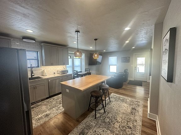 The open-concept living area is filled with natural light and features plush seating and a chic coffee table. Enjoy movie nights on the brand new 75 ONN TV with Roku built in. The fully remodeled and stocked kitchen has an induction range with air fryer, microwave, dishwasher, and an island with stools, perfect for casual meals or social mornings. Laundry is a breeze with the washer and dryer in the basement.
