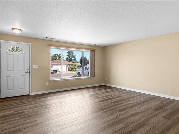 Don't miss this move in ready single level 3 bed 2 bath home. Outside you are greeted by fresh, low maintenance landscaping, including new rocks and weed liner, as well as a large driveway for ample parking. Inside you are welcomed by an abundance of natural light and new flooring throughout. The smart floorplan hosts an open kitchen and dining area complete with sliding doors to the covered patio and fully fenced backyard, as well as a spacious living room, full bathroom, two generously sized bedrooms, and a primary with full ensuite. A dedicated laundry room flows seamlessly to the attached 2 car garage. With recent updates like newer AC, newer stove, newer toilets, this home has it all; come take a look today!