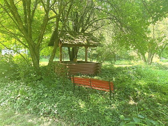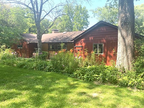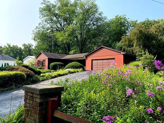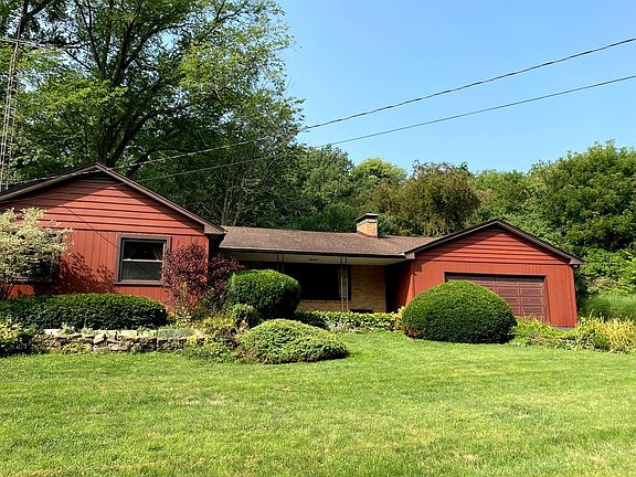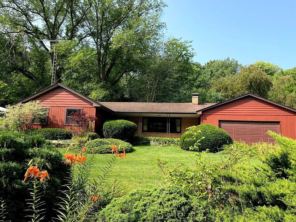 Custom 3 bedroom, 1.5 bath brick ranch with a 2.5 car garage on a beautiful private 1 acre wooded lot with many perennials. Large kitchen with hardwood and custom cabinets with pull out shelving, under cabinet lighting, large island breakfast bar and additional space for dining. All appliances remain. The remodeled bath has a large gorgeous walk-in-shower. First floor laundry. The family room features a brick wood burning fireplace, bay window and custom wood ceiling. The large backyard contains a covered back porch, hot tub, redwood custom wishing well and shed for storage. This is a beautiful country setting yet close to everything including nearby state parks. The home is being sold as is. Agent is related to seller.