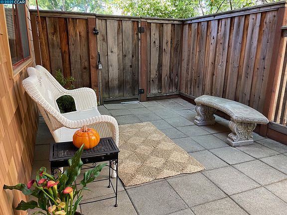 Price Correction: Same unit in complex recently sold off market in July at $674K. **No rental restrictions**This beautiful, rare end unit is one of four in the complex. Large backyard patio and wrap around lot. Spacious front patio, too! Lots of storage under stairs and in back yard storage closet. California custom closets in both bedrooms for added storage. Yard in back and side are fully equipped with automatic sprinklers. Laminate flooring except for tile in kitchen and dining room. Newer appliances are approximately five yrs old.French doors to back yard off dining room have retractible hidden screens. Windows have custom shades that pull up and down. Wood burning fireplace in living room. Hidden pull out desk is built into dining room cabinets. HOA dues of $488/mo include exterior siding, roof, water, sewer, reserves and community pool. A treasured location close to Iron Horse Trail and downtown Walnut Creek!