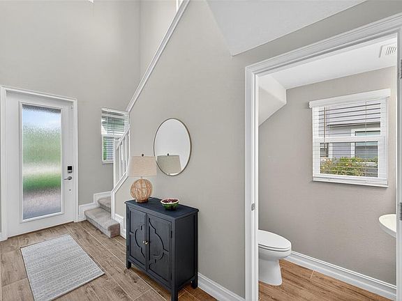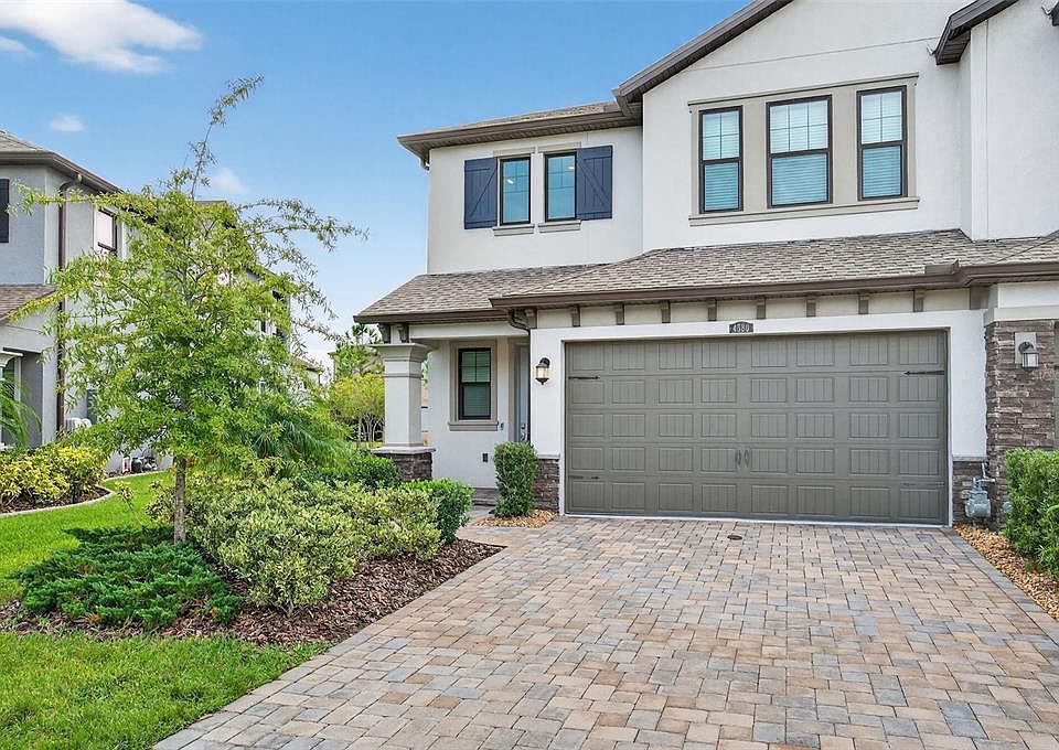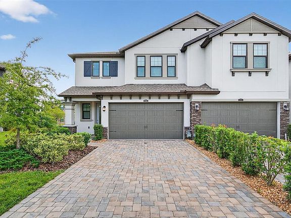 One or more photo(s) has been virtually staged. Desirable ESTANCIA Community and sought after location at Wiregrass in Wesley Chapel. Built in 2022 this townhome is move in ready! This Smart home features thermostat control. 3 Br., 2.5 Bath, Oversized 2 car garage. Beautiful curb appeal, pavered driveway. Open floor plan. Gorgeous plank tile throughout living space, Spacious Kitchen has Quartz Counter tops, Stainless steel appliances. 42" soft close cabinets and large kitchen island breakfast bar overlooking the family, dining, and dinette areas. The sliding glass doors to the lanai is covered and screened in. Upstairs, there are 3 bedrooms. The Primary Bedroom has a nice tray ceiling and in addition its own private screened-in covered balcony. The primary private bathroom has a walk-in shower, huge walk-in closet, and double vanity sinks. Laundry room with full size washer and dryer is located on the second floor. The amenities include the Resort-style heated pool with lap lanes, a Fitness Center, Clubhouse, recreational events, Tennis, Basketball and Pickleball Courts, park, dog park and walking trails. Outside the Community there are Medical Facilities and Specialists, Hospitals, Malls, shopping, restaurants and more. A+ Rated School District. Easy access to highways and Downtown Tampa.