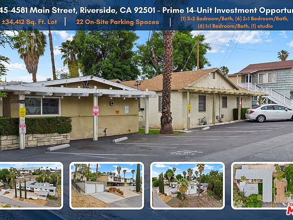 We are pleased to present 4545-4581 Main Street, a 14-unit multifamily investment opportunity located near Downtown Riverside. Just off Magnolia Avenue and 14th Street, the property spans three contiguous parcels totaling 34,412 square feet and consists of five separate buildings, including a standalone 3-bed/2-bath home, three duplexes, and one 7-unit structure. Nearly all units are single-story, offering tenants a comfortable, residential feel in a walkable, well-connected location. The unit mix includes one 3-bed/2-bath home, six 2-bed/1-bath units, six 1-bed/1-bath units, and one studio. Tenants benefit from mini-split A/C systems, 22 on-site parking spaces, on-site laundry, and newer roofs key features that support tenant satisfaction and long-term stability. Additional stand-alone garages offer rental income potential as storage units, along with two owner's rooms that may be convertible to garages or ADUs (buyer to verify feasibility). The asset is currently operating at a 6.35% cap rate and 10.92 GIM, with in-place income and modest upside through future rent increases. Located steps from Riverside City College and minutes from UC Riverside, the property is surrounded by retail, employment centers, and Riverside's most notable attractions including the Mission Inn Hotel, Cheech Marin Center, and Mount Rubidoux Park. With strong fundamentals and a desirable unit mix, this offering presents a rare opportunity for investors seeking stable cash flow in one of the city's most proven rental markets.
