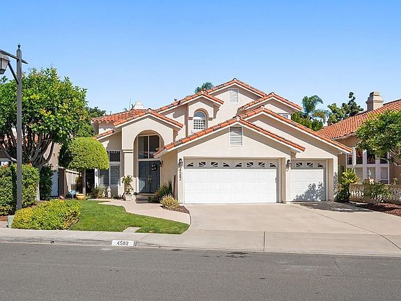 Cantamar Plan 3 in a prime location! This 4-bedroom home w/ loft & 3 full baths offers functional layout w/ bedroom & full bath on entry level. Kitchen features granite countertops, walk-in pantry, island with gas range, & stainless steel appliances. Spacious primary bedroom includes gas fireplace, en-suite bath & walk-in closet. Solar panels, 3-car garage, & AC are key elements. Hardwood & travertine flooring highlight the main level, w/ carpet upstairs. Backyard includes a built-in BBQ island and refrigerator. Close to parks, schools, shopping, & beach.