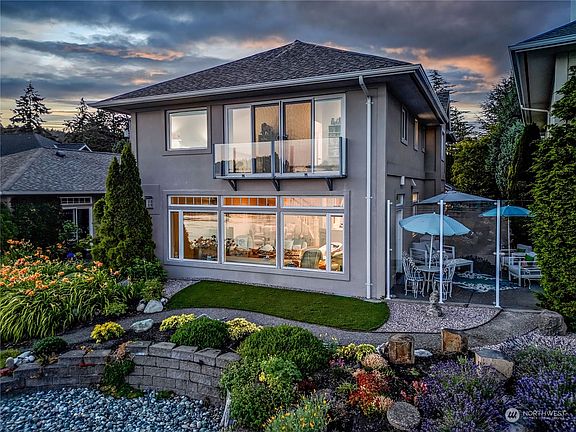 Coveted Pleasant beach waterfront, Bainbridge Island's Gold Coast. As you step into this lovely two story home, you are greeted with sweeping views of the Sound. Lush gardens lead to a charming light filled kitchen with vintage barn door pantry. The living/dining great room is an entertainer's dream. French doors lead to the adjacent patio with storm glass for year-round outdoor enjoyment. Your low bank waterfront brings the gorgeous views inside. Enjoy an attractive main level bedroom with ¾ bath. Cascading stairs lead to the second floor en-suite with walk-in closet, full bath, & sitting area. There is an additional guest bedroom with a private bath just down the hall. Located in the heart of Lynwood Center. Walk to shops & dining.