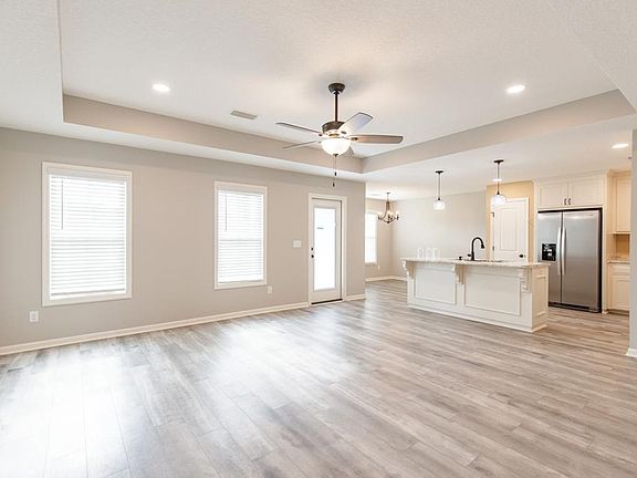 Step into the inviting living room, where luxury vinyl plank (LVP) flooring offers both durability and modern appeal. A tray ceiling adds depth and architectural interest, while recessed can lighting and a ceiling fan create a bright, comfortable atmosphere. The open-concept design connects seamlessly to the kitchen and dining area, promoting a natural flow for daily living and entertaining.