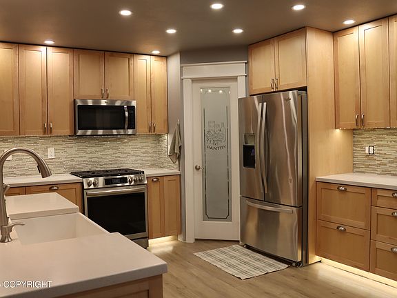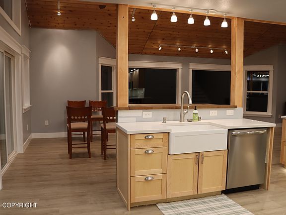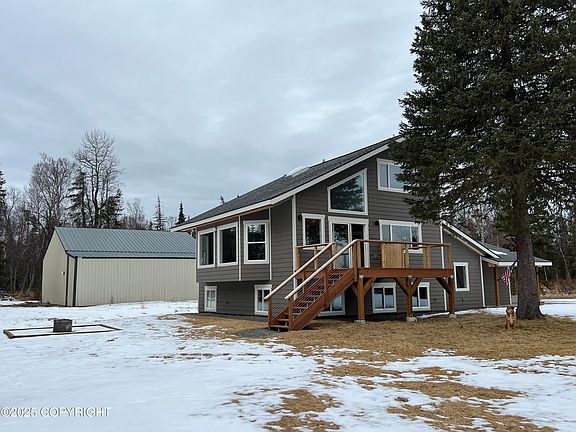 Amazing Salamatof Lake Views! And a Hangar!! Everything in this home has been thoughtfully updated with amazing details! Open concept with vaulted ceiling on the main floor, pantry with a bonus sink, Top Floor is all Primary living for great privacy with a beautiful bathroom and walkthrough closet, check out that tub! Lower level has 2 large bedrooms, family room with wood stove, bathroom/laundry672 sq ft attached garage, 1760 sq ft Hangar/Shop with new boiler, 528 sq ft carport- means plenty of room for all your toys! Easement allows access to creek which empties out into Salamatof Lake- See in documents. Watch the planes land and take off from your back porch! See seller's attachment in documents of all home renovations made to property! (Too many to list!)