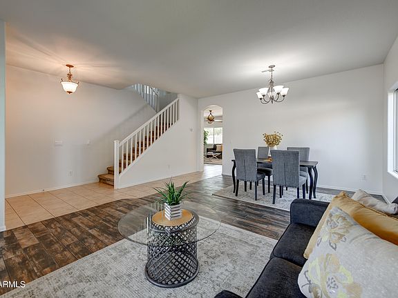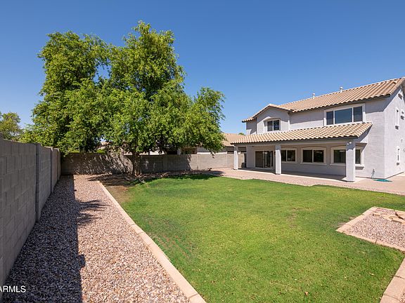 Five bedroom home in popular community of Sun Groves, situated on large lot with lots of grass and walking distance to three parks! Down the street is Mustang Park offering two basketball courts, covered playground, sand volleyball court, walking & biking paths, and grass areas. The home has great curb appeal and the lot is fully landscaped. All the cabinetry has just been refurbished with sparkling white, and both the interior & exterior of the home were painted. Island kitchen opens to the family room and features quartz countertops and stainless steel appliances. A sliding glass door exits to a covered paver patio & large grass area, even a mountain view! Also on the main level is a guest bedroom with full bath across the hall, perfect for guests or home office. The living & dining greatroom is off the main entrance. Upstairs are the remaining four bedrooms and two bathrooms, including a spacious primary suite with two walk in closets. A loft bonus room is perfect for 2nd family room, playroom, game room, etc. Owner installed additional slab parking spot to left of driveway. Just north of the home is the huge Chuckwalla Community Park and Woodchuck Park both next to Navarrete Elementary School. Together they include covered playgrounds, lots of grass areas, more sand volleyball courts, and nice mountain view! Neighborhood is convenient to schools, shopping, dining and entertainment venues, and located less than a mile from Basha High School.