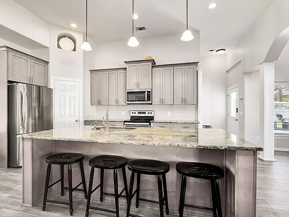 Southern Jewel lives up to its name, offering a radiant coastal retreat just minutes from the sugar-white sands of Crystal Beach. Set on an expansive double lot, this six-bedroom, five-bath home offers more than 3,800 square feet of thoughtfully designed living space and a wealth of outdoor amenities ideal for entertaining. The inviting open-concept floor plan flows seamlessly from the spacious kitchen with granite countertops and stainless appliances to the living and dining areas, where guests can gather before stepping outside to enjoy the private heated pool, spa, and outdoor kitchen. A wraparound porch provides additional space for relaxation or casual meals under the palms. Inside, two oversized primary suites on the main level provide comfort and privacy, while the upper floors feature additional guest suites, bunk rooms, and a large entertainment area perfect for movie nights or game gatherings. Recent updates enhance both style and function, including a new roof and flooring, remodeled baths, and a resurfaced pool and spa. Sold fully furnished and free from HOA restrictions, Southern Jewel offers exceptional flexibility as a primary home, vacation retreat, or established rental property. With ample parking, a generous backyard, and a location just a short stroll from public beach access, this Crystal Beach gem pairs relaxed coastal charm with investment potential.