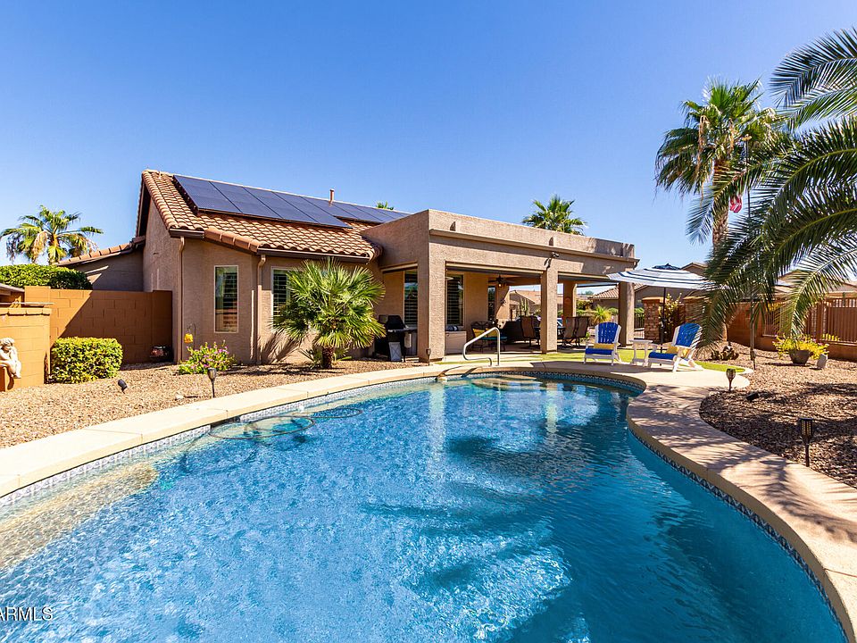 Sparkling poolCovered patioOpen floor planTall ceilingsCorner lotTons of natural lightMature landscape