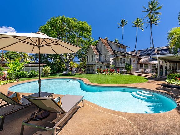 The outdoor spaces at Kahala Palms elevate the experience. The expansive backyard boasts a sparkling swimming pool, jacuzzi, and patio surrounded by tropical landscaping. The tranquil garden provides the perfect space for sunbathing, evening stargazing, or hosting friends and family. Proximity to the beach offers easy access to leisurely walks along the shore and a variety of water activities, ensuring a full Hawaiian experience.